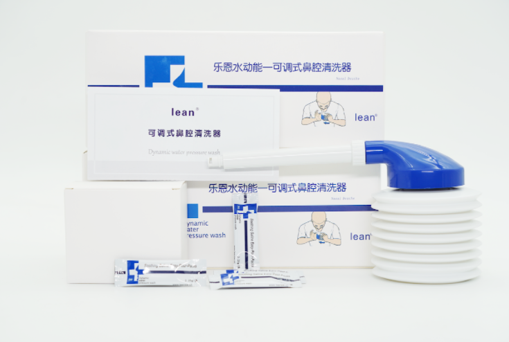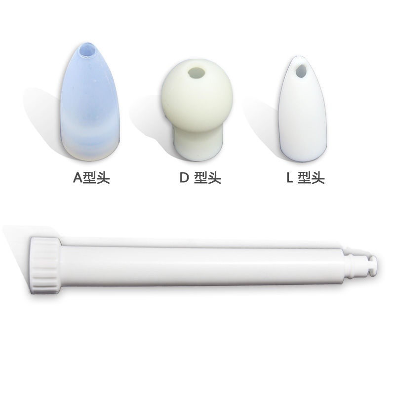 可調(diào)式鼻腔清洗器的噴頭均采用醫(yī)用硅膠制成,盒內(nèi)含有鼻前庭外置橄欖型、鼻前庭內(nèi)置非軸向和軸向型三種標(biāo)配噴頭,分別使用可以滿足圍手術(shù)期和變應(yīng)性鼻炎的不同治療需求,其中鼻前庭內(nèi)置非軸向噴頭出液口在"鼻閾"后方出液,通過(guò)調(diào)節(jié)出液口角度可靶向沖洗到鼻腔穹頂、嗅裂區(qū)、和多個(gè) FESS 術(shù)腔,對(duì)鼻內(nèi)分泌物、吸入性變應(yīng)原、吸入性致病源、術(shù)后結(jié)痂等物質(zhì)的清除效果好。研究數(shù)據(jù)證明:125ml或175ml液體持續(xù)沖洗鼻腔可達(dá)到100%鼻腔分泌物清除率。